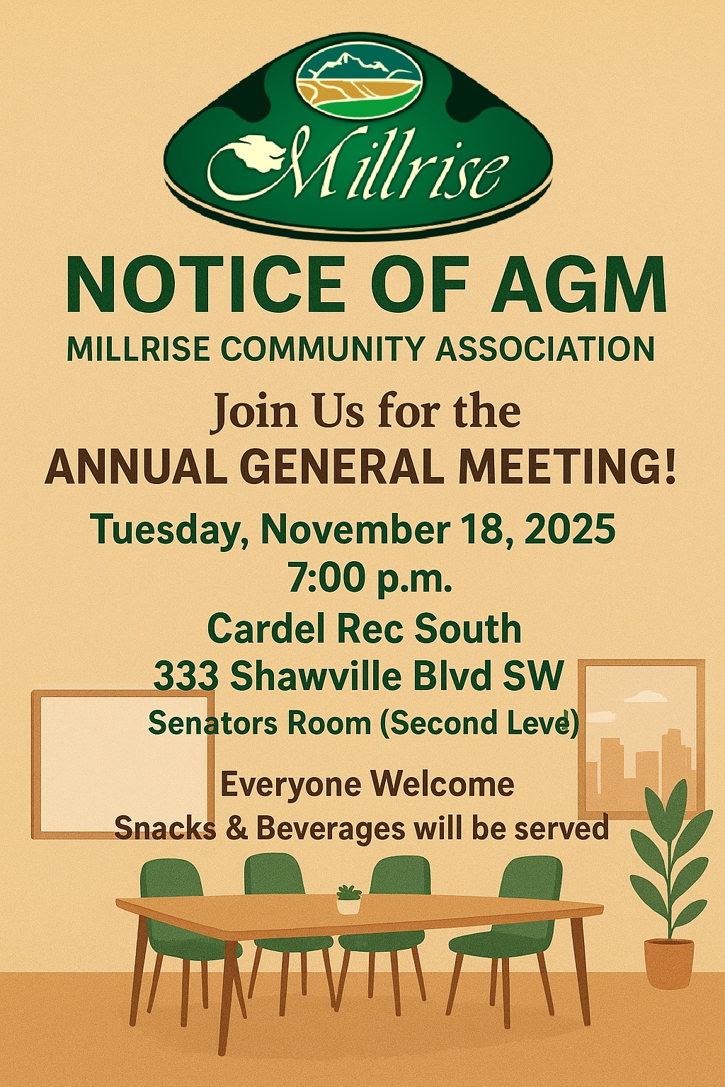 We invite all Millrise residents and Millrise Community Association Members to attend our Annual General Meeting on Tuesday, November 18, 2025, at 7:00 p.m. at Cardel Rec South (333 Shawville Blvd SW), Senators Room (Second Level).